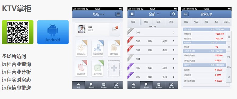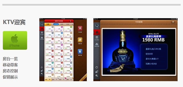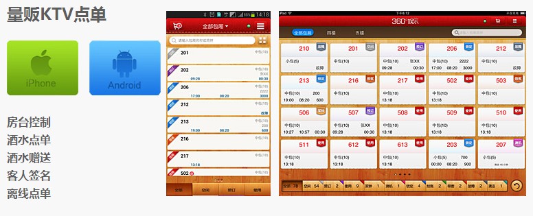 360°娱乐移动管理系统 360°娱乐移动管理系统是专门针对高端夜总会、酒吧及大型连锁量贩KTV独立设计的智能移动管理系统,适合KTV场所不同层次人员使用。通过Apple IOS/Andriod平台的智能手机终端或移动平板电脑,即可快速实现点单、赠送、房台控制、营业查询、实时房态浏览等。KTV经营管理者亦可以高屋建瓴,便捷高效地进行场所访问、信息推送、营业数据分析等远程操作,助力KTV企业经营管理实现移动化、便捷化,简化传统管理流程,大幅提升运营管理效率。