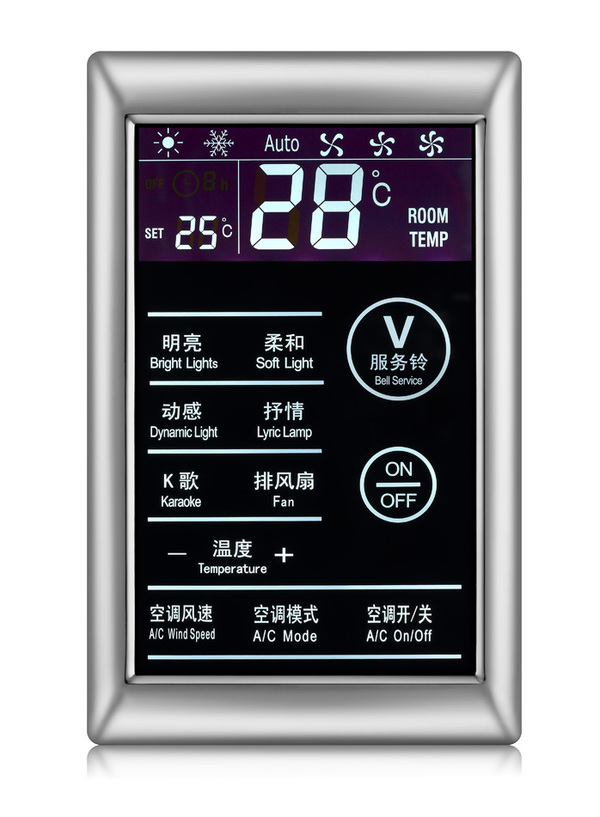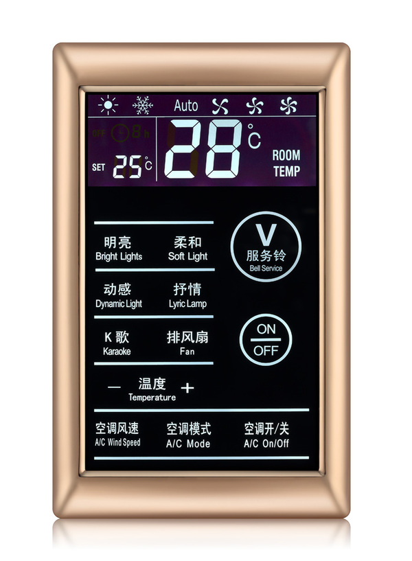 产品简介:  KTV智控墙板拥有独特的LED温控显示系统,采用钢化玻璃面板、锌合金边框、,外观晶莹剔透,高贵大方,电容式触摸按键,操作舒适,手感极佳,控制精准;采用86式底盒安装,施工方便;灯光场景调节、空调调节、服务控制等(可根据需求定制)支持空调温度采集及恒温控制;