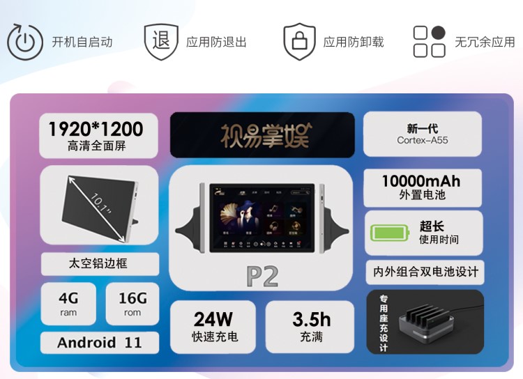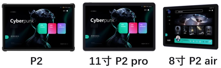 视易P2掌娱系列平板,KTV专属娱乐终端,三种款型——10.1吋桌面平板P2、11吋磁吸平板P2 PRO和8吋磁吸平板P2 AIR,全面覆盖派对K、商务K、混合K等多种娱乐应用场景。K场可以根据项目特点灵活组合,更好地满足不同项目和使用人群的点歌、点单与多元化娱乐需求。